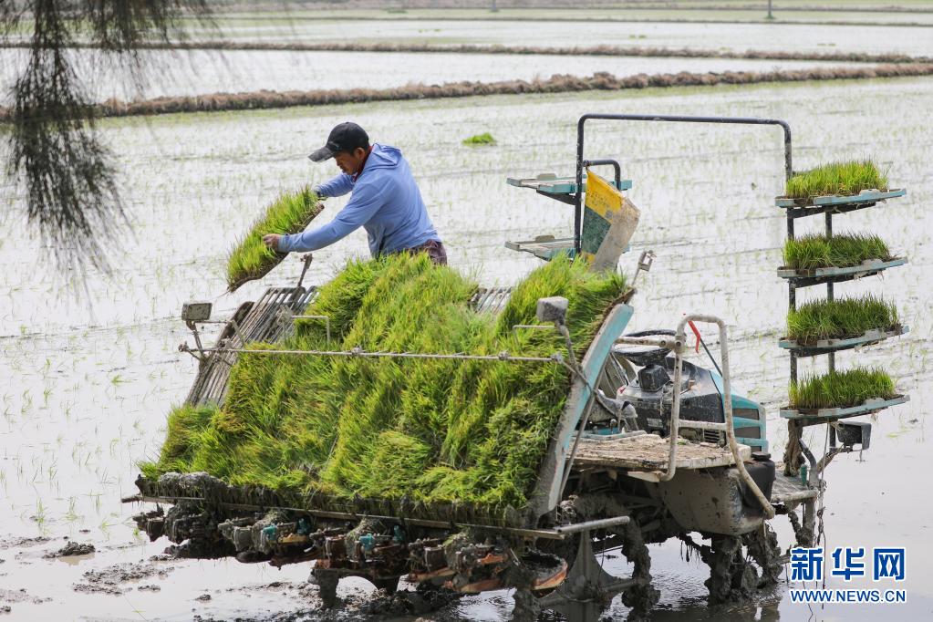 4月5日,在福建省晉江市九十九溪水稻高效栽培科技示范基地,工作人員將秧苗擺放在插秧機(jī)上。