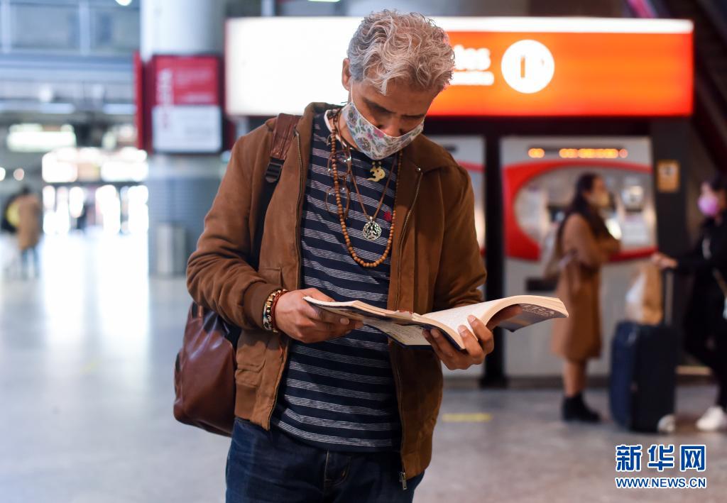 4月17日,一名男子在西班牙馬德里一處車站內(nèi)讀書(shū)。
