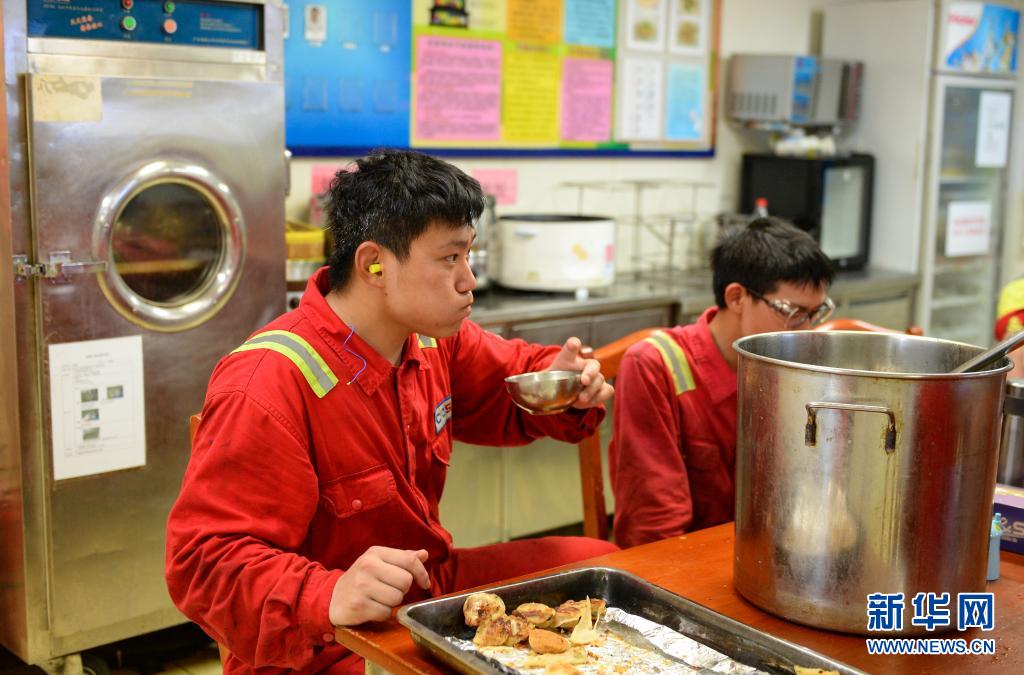 4月25日,中國(guó)海油樂東15-1氣田的工人在工間休息時(shí)用餐。