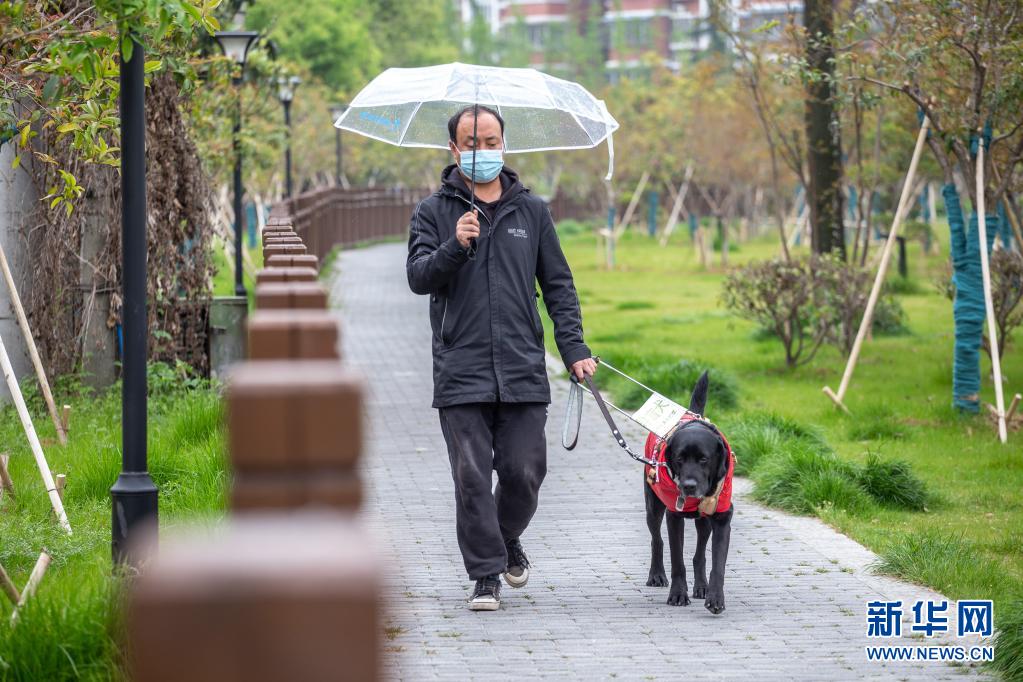 吳虎剛今年45歲,和同是盲人的妻子經(jīng)營著一家盲人推拿診所。每天上班,導(dǎo)盲犬“C羅”都會陪伴吳虎剛從家走到診所(4月11日攝)?! ⌒氯A社發(fā) (張夢 攝)
