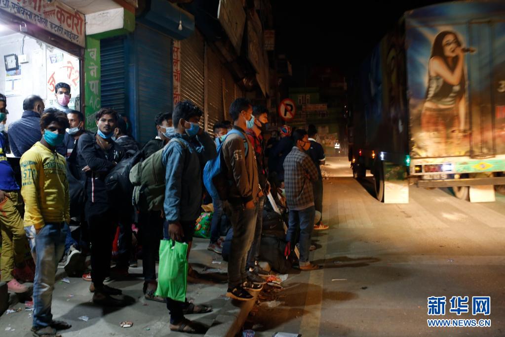 4月28日晚,人們?cè)谀岵礌柺锥技拥聺M都的路邊等車(chē),準(zhǔn)備在封禁措施實(shí)施前離開(kāi)加德滿都返回家鄉(xiāng)。
