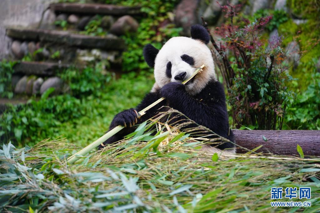這是5月15日在中國(guó)大熊貓保護(hù)研究中心雅安碧峰峽基地拍攝的大熊貓。