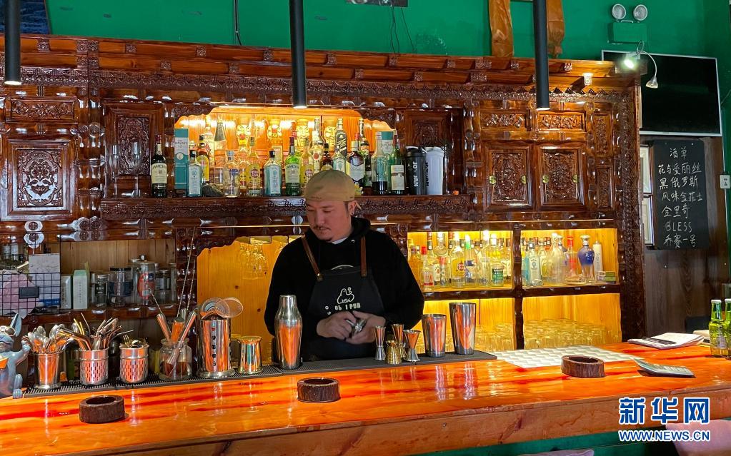 才仁俄賽在餐廳調(diào)酒(4月12日攝,手機照片)。新華社記者 劉江 攝