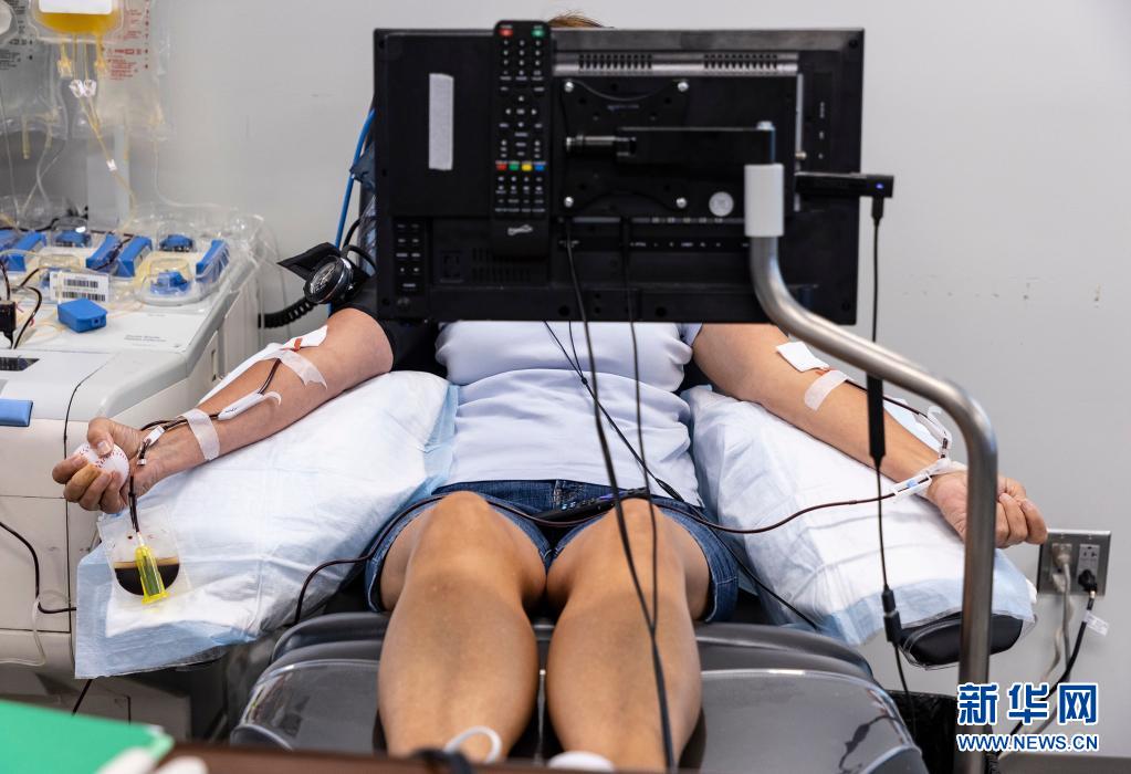 6月14日,在美國芝加哥,一名獻血志愿者在大芝加哥地區(qū)紅十字會一獻血站內(nèi)獻血。新華社發(fā)(喬爾·萊納攝)