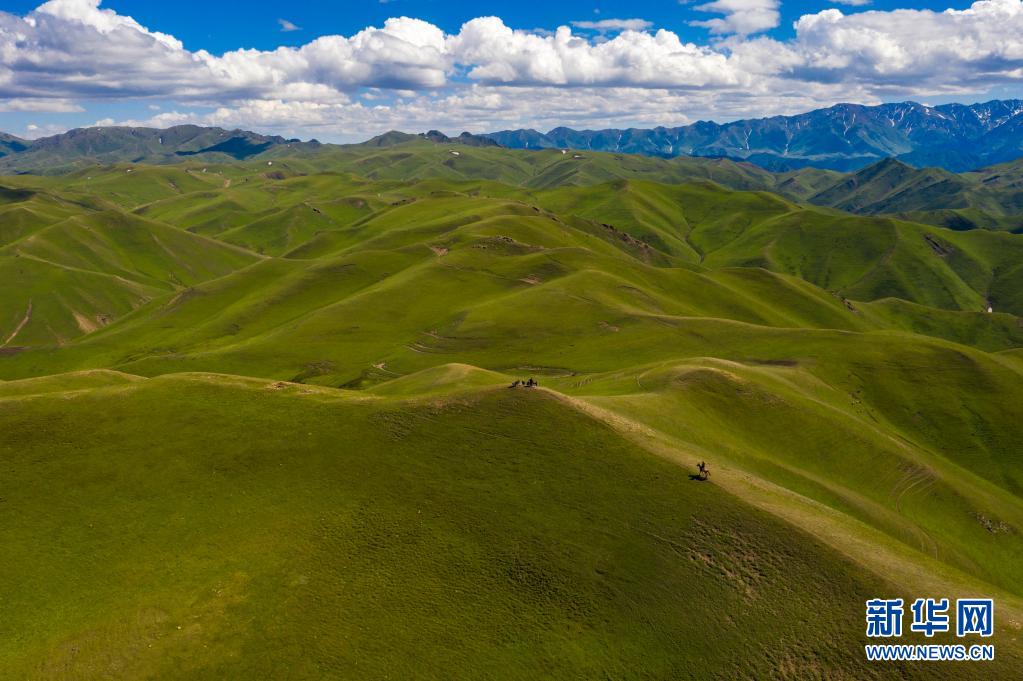 新疆裕民縣的牧民策馬奔馳在巴爾魯克山區(qū)夏牧場(chǎng)上(6月15日攝,無(wú)人機(jī)照片)。