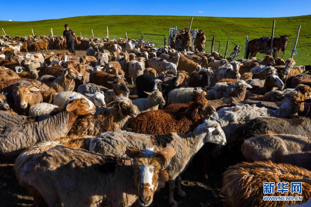 來自縣城的商人在裕民縣巴爾魯克山區(qū)夏牧場(chǎng)上收購(gòu)小羊(6月14日攝)。