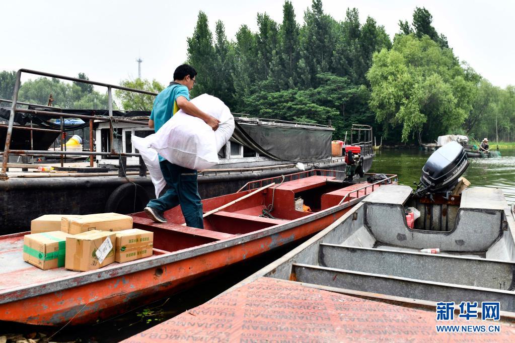 6月20日,在微山縣南陽鎮(zhèn),郵遞員王少朋往郵船上裝郵件,準(zhǔn)備為村民投遞。