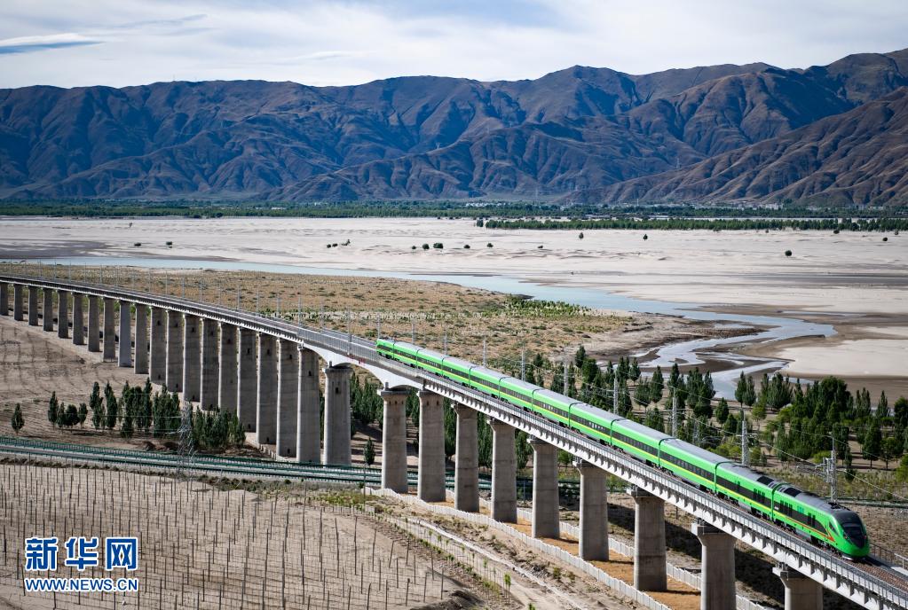 試運(yùn)行的復(fù)興號(hào)列車行駛在雅魯藏布江畔(6月16日攝)。