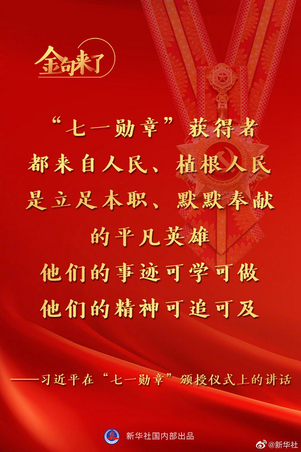 習近平說,“七一勛章”獲得者都來自人民、植根人民,是立足本職、默默奉獻的平凡英雄。他們的事跡可學可做,他們的精神可追可及。他們用行動證明,只要堅定理想信念、堅定奮斗意志、堅定恒心韌勁,平常時候看得出來、關鍵時刻站得出來、危難關頭豁得出來,每名黨員都能夠在民族復興的偉業(yè)中為黨和人民建功立業(yè)!