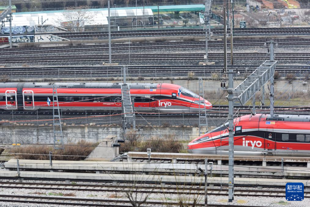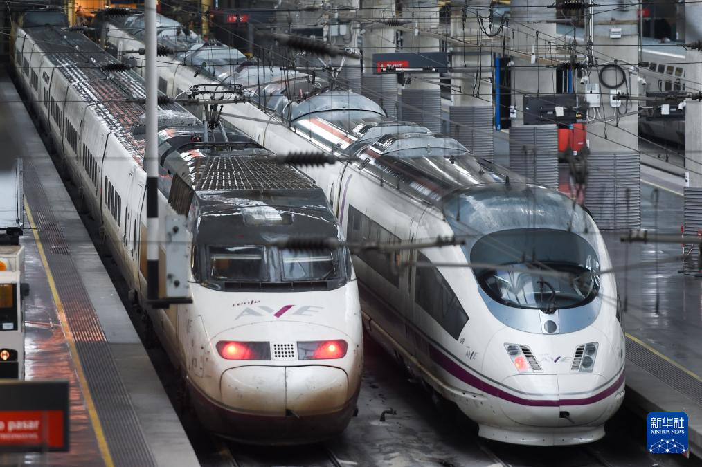 1月21日,在西班牙马德里,两列高铁列车在阿托查车站附近行驶。新华社发(古斯塔沃·巴连特摄)