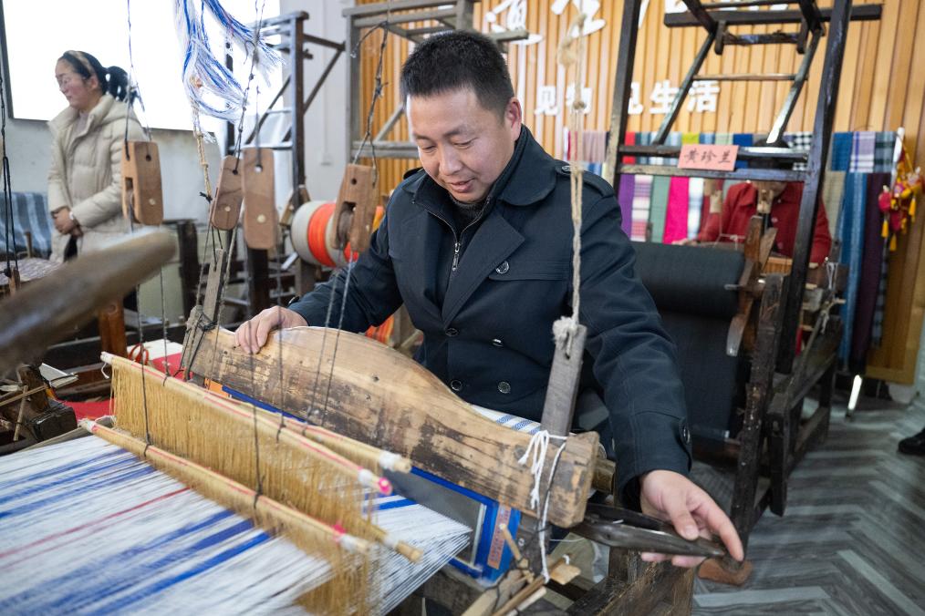 这些年,陶文成的大布生意越来越红火,产品涵盖服饰、床品、文创产品、装裱字画等20多个品类。为凸显当地红色文化底蕴,他还耗时十天,将家喻户晓的革命歌谣织进手工作品。