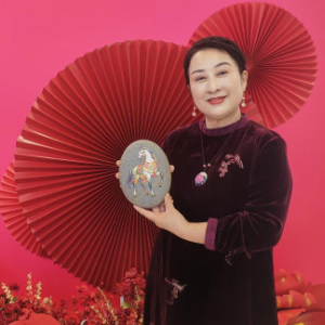 非遗代表性传承人宋笑珍展示创作的马年黄河石画。新华社记者艾福梅 摄