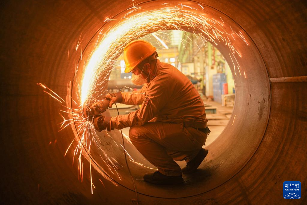 2月24日,在江苏省连云港经济技术开发区重山风电设备公司车间,工人在生产风电塔架。