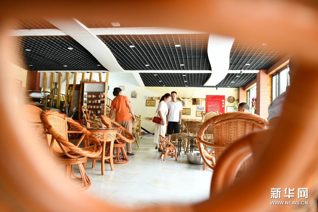 7月10日,在遵義市匯川區(qū)板橋鎮(zhèn)婁山關(guān)社區(qū),游客在一家藤編產(chǎn)品專賣店選購產(chǎn)品。藤編技藝是遵義市級(jí)非物質(zhì)文化遺產(chǎn)。近年來,貴州省遵義市匯川區(qū)板橋鎮(zhèn)采取“支部+產(chǎn)業(yè)+農(nóng)戶+旅游”的生產(chǎn)經(jīng)營模式,建立非遺工坊,成立藤編產(chǎn)業(yè)協(xié)會(huì),開展技能培訓(xùn),開設(shè)旅游商品門面,不斷發(fā)展壯大藤編產(chǎn)業(yè),助力群眾增收。新華社發(fā)(羅星漢 攝)
