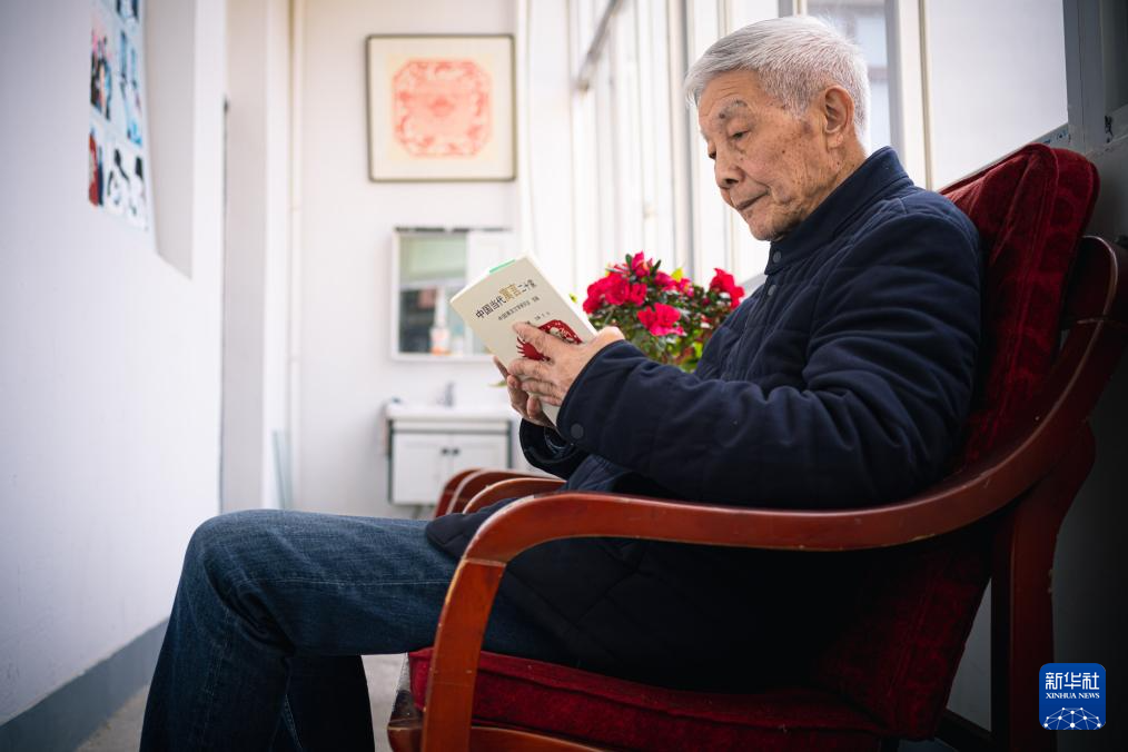 卢发良在工作室内读书寻找创作灵感(3月12日摄)。