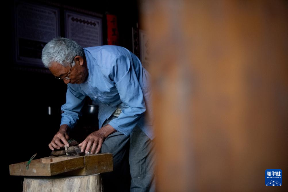 5月16日,陈永霞在老屋内手工雕刻阳戏面具。