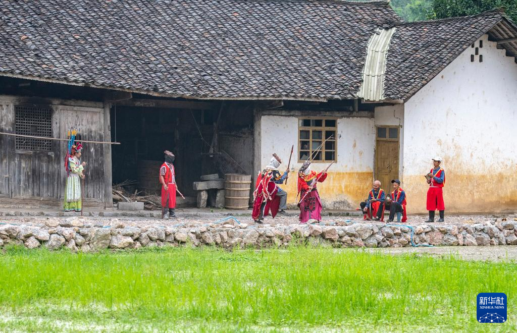 5月16日,在稻田旁的一间老屋前,戏班子成员练习阳戏剧目《三打柳州》片段。