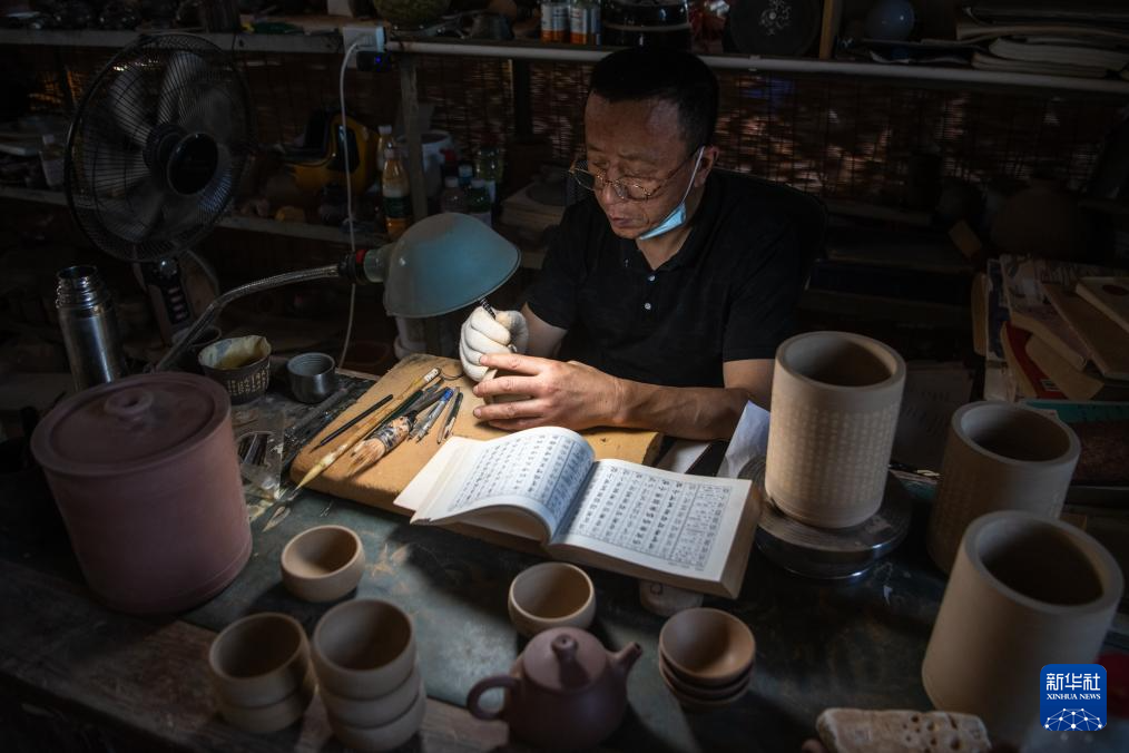 5月25日,在管窑镇“柿外陶园”窑工小院,制陶工人在画胚。