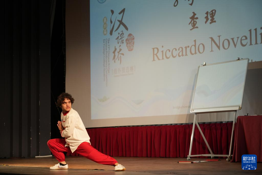 5月24日,在意大利马切拉塔大学举行的第23届“汉语桥”世界大学生中文比赛意大利暨圣马力诺赛区比赛上,参赛选手进行武术才艺展示。