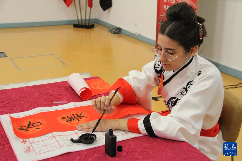 5月25日,在葡萄牙首都里斯本举行的第23届“汉语桥”世界大学生中文比赛葡萄牙赛区比赛上,参赛选手展示书法才艺。