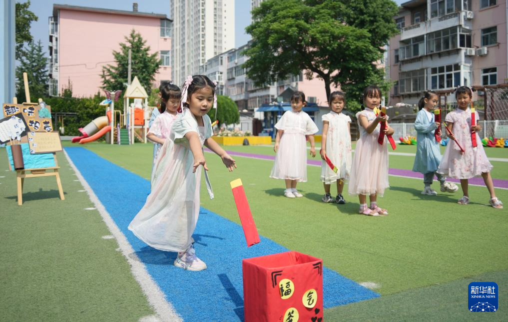 6月6日,在山东省潍坊市潍城区实验小学幼儿园,孩子们在参加趣味投壶活动。