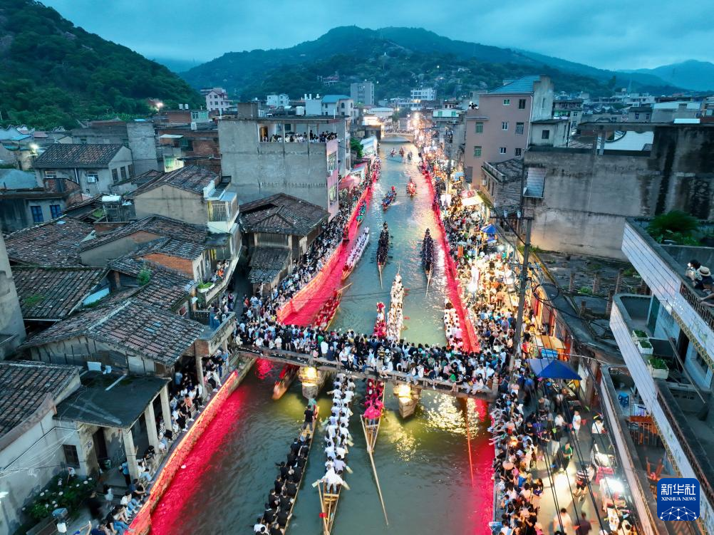 6月9日,福建省福州市长乐区三溪村夜赛龙舟民俗活动如约而至。随着夜幕降临,三溪村民及远道而来的龙舟爱好者们组成的龙舟队驭舟飞驰,挥桨竞渡,南溪两岸及石桥上人潮如涌,热闹非凡。