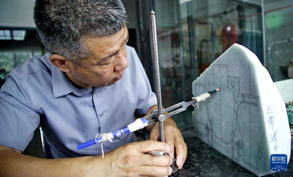 张铁成在工作室内为一块即将开始雕刻的玉石描图(6月15日摄)。