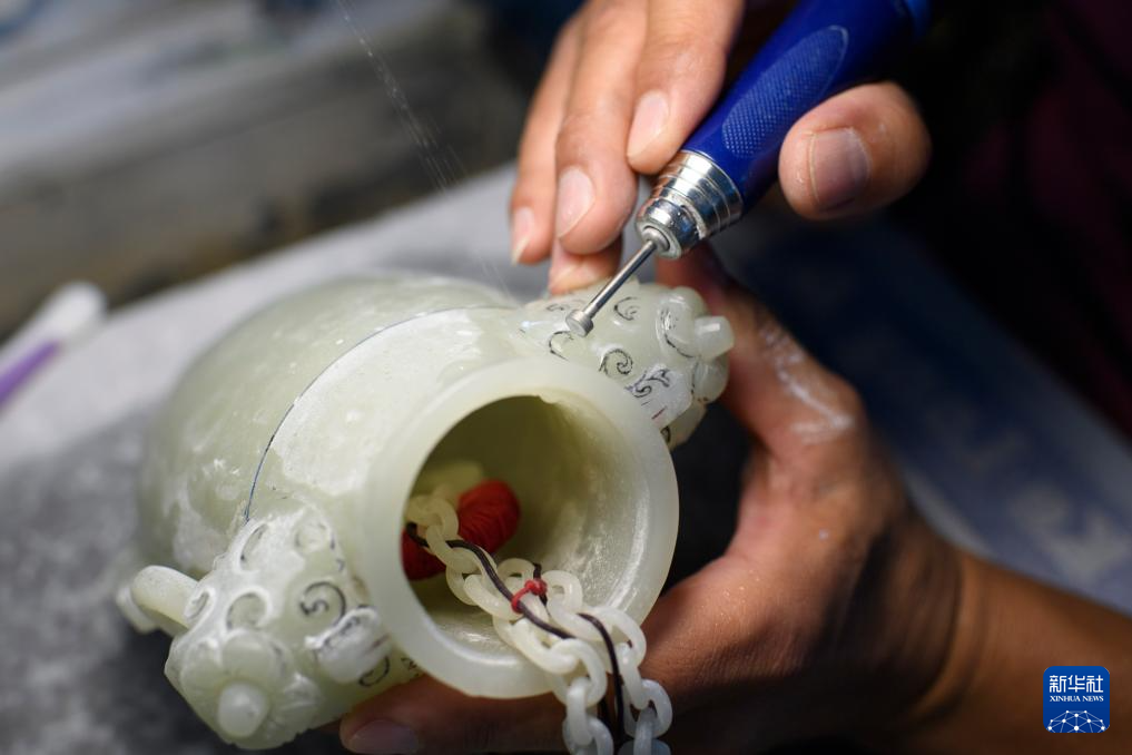 张铁成在工作室内进行玉雕创作(6月15日摄)。
