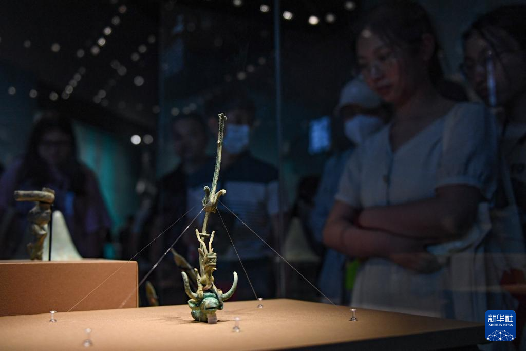 6月27日,观众在观看展品青铜祭坛零件(铜龙形器)。