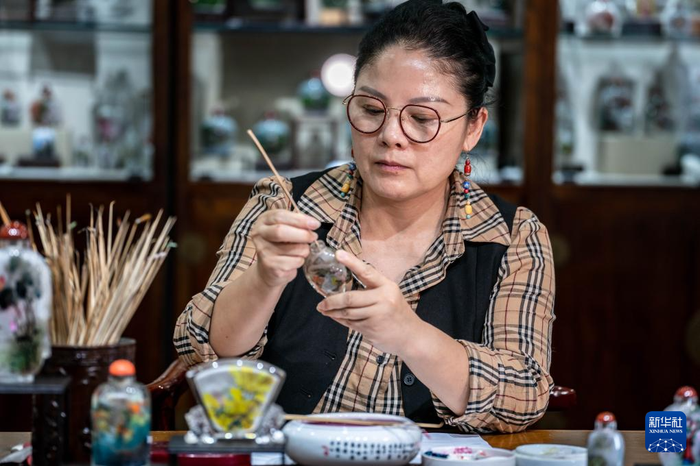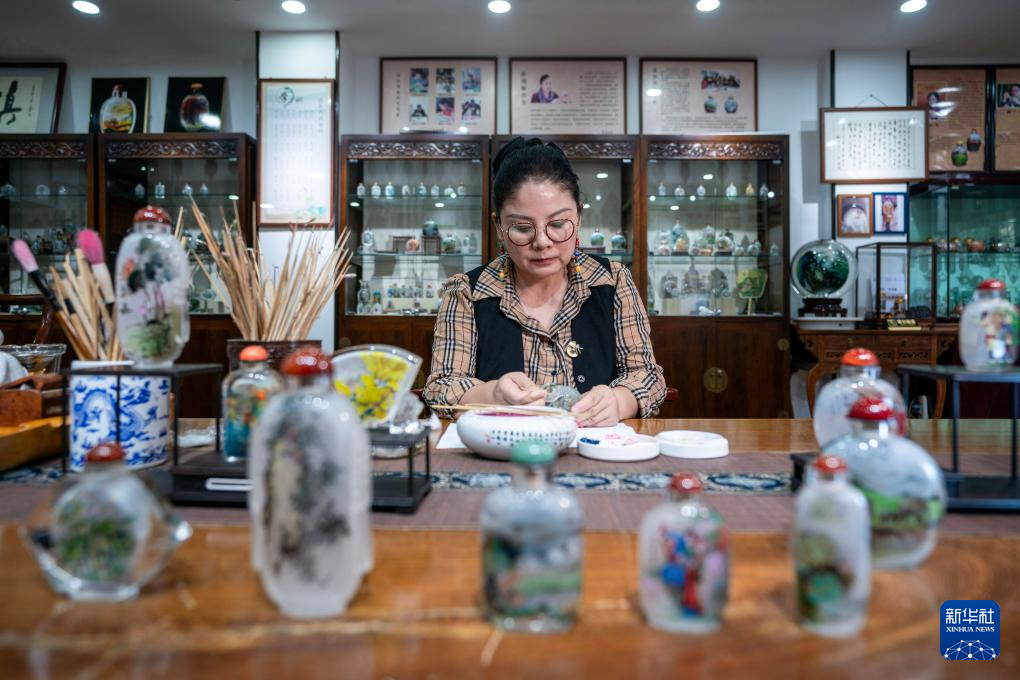 孙鸿雁在位于昆明官渡古镇的滇派内画传习馆内进行内画创作(7月3日摄)。