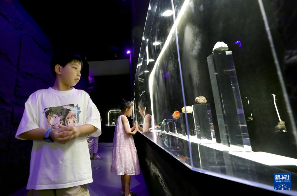 7月16日,一名小朋友在重逾1吨的“巨无霸满天星”晶洞前驻足观看。