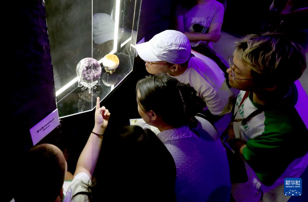 7月16日,参观者在一组产自巴西的玛瑙外壳紫水晶球体展品前驻足观看。