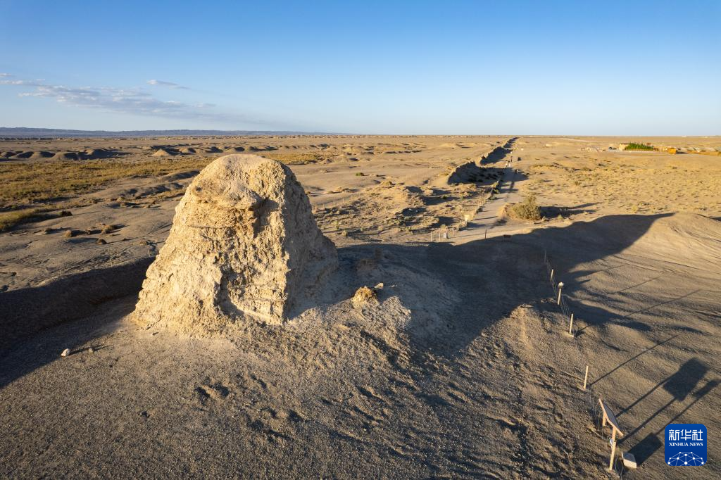7月17日在甘肃省敦煌市玉门关遗址区拍摄的当谷燧和汉长城(无人机照片)。