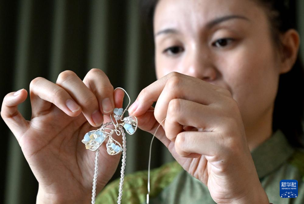 楚蒙丹在位于洛阳市的非遗体验馆里搭配珍珠辑珠胸针(9月12日摄)。