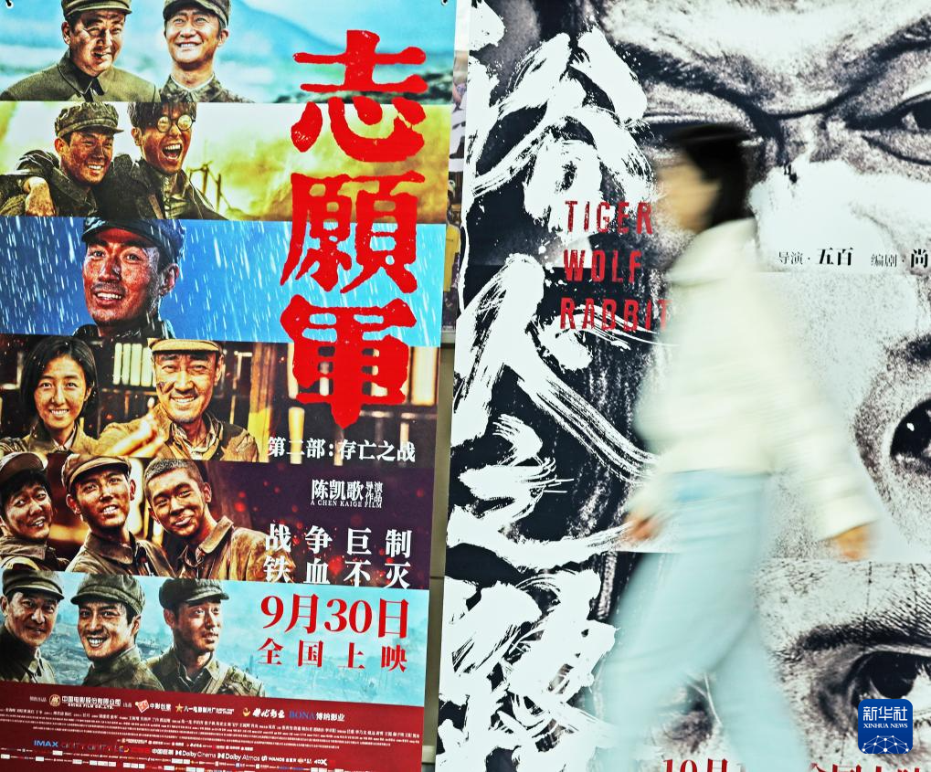 10月7日,在山东省临沂市郯城县一家影城,观众从电影海报前走过。