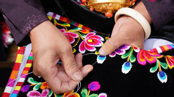 一名老师带着几名孩子在广西来宾市象州罗秀镇纳禄村学习扇面制作(10月10日摄)。