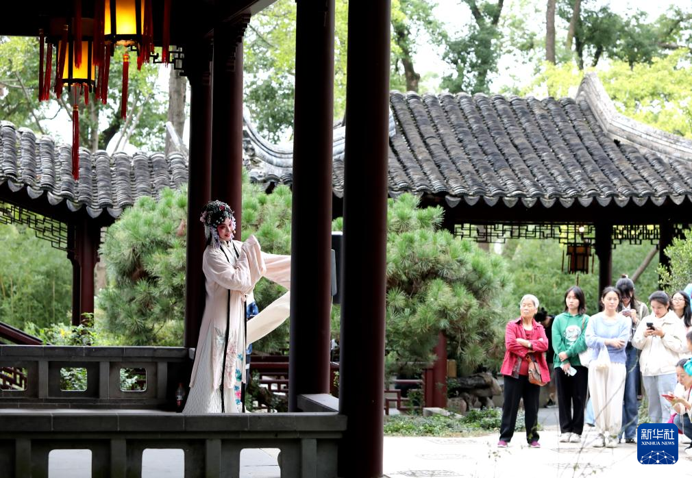 10月19日,演员在苏州虎丘山景区为游客表演昆曲。