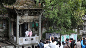 10月25日,两名游客在波兰华沙现代艺术博物馆新馆中的一处雕塑前留影。