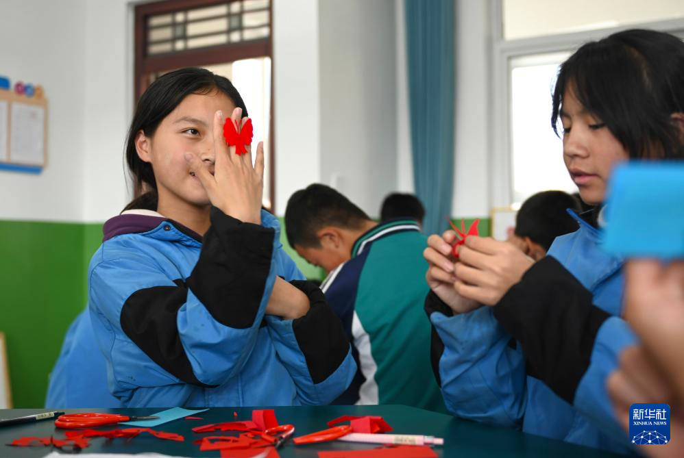 11月1日,在固原市隆德县杨河中学,学生在课堂上剪纸。