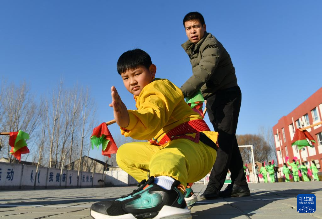 12月22日,在南皮县冯家口镇车官屯小学,沧州落子第六代传承人张洪通(前右)在指导学生练习沧州落子。