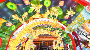 1月22日,游客在河南省开封市龙亭公园观赏彩灯造型景观。