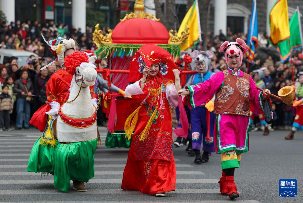 1月22日,在绵竹年画节开幕式上,踩着高跷的演员与群众互动。
