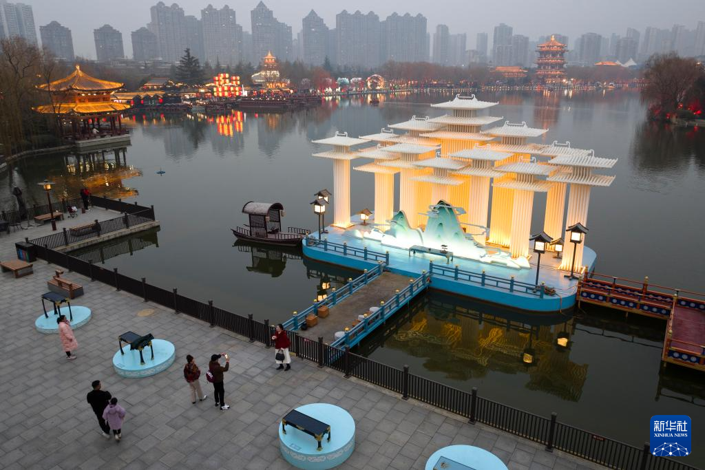 1月22日晚,游客在西安大明宫国家遗址公园赏灯(无人机照片)。