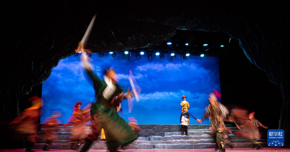 这是西藏首部少儿舞台剧藏戏《顿月顿珠》演出现场,罗桑朗觉(右三)在剧中饰演“顿月”(2月11日摄)。