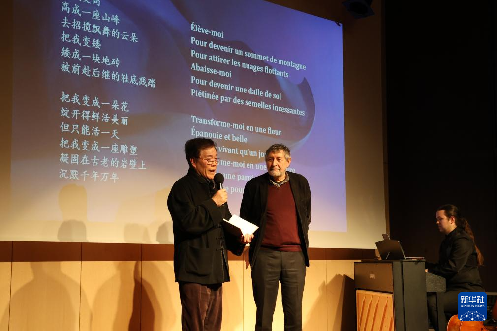 4月8日,在法国巴黎中国文化中心举办的“诗歌的邂逅——‘话中国’中法诗会”现场,中国诗人赵丽宏(左)与法国诗人让-皮埃尔·西梅翁(右)分别用中文和法语朗读中国诗歌。新华社记者 张百慧 摄