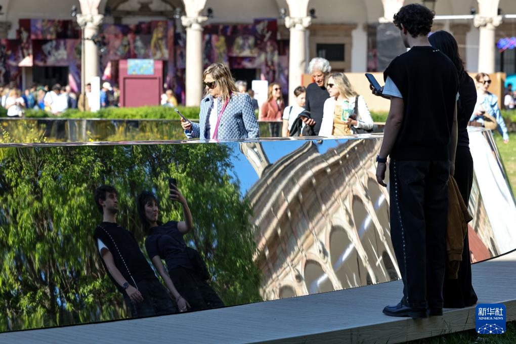 4月11日,在意大利米兰国立大学,人们参观中国设计师陈耀光的镜面装置作品《礼物》。
