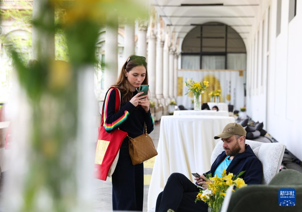 4月12日,在意大利米兰国立大学,人们在顾家家居展区参观体验。