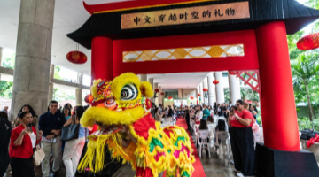 4月19日晚,天津交响乐团常任指挥易娟子在桥边音乐汇演出活动上指挥。
