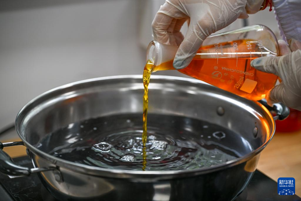 陈琰璐把补色的染料倒进容器里,准备进行染色(5月18日摄)。