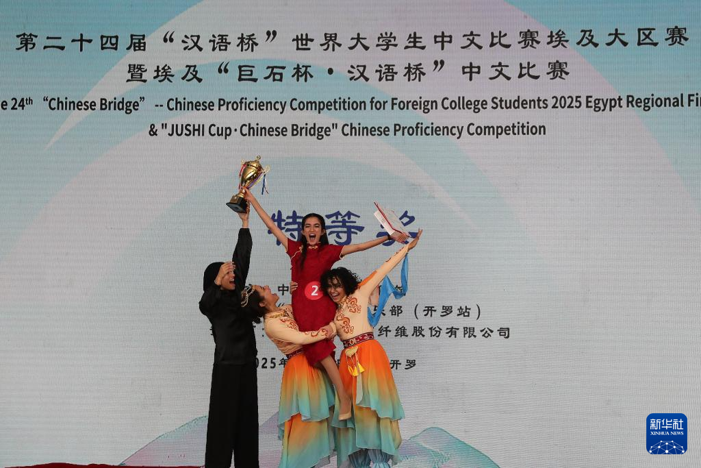 5月17日,来自开罗大学的奥拉·谢里夫获得特等奖后和同学庆祝。